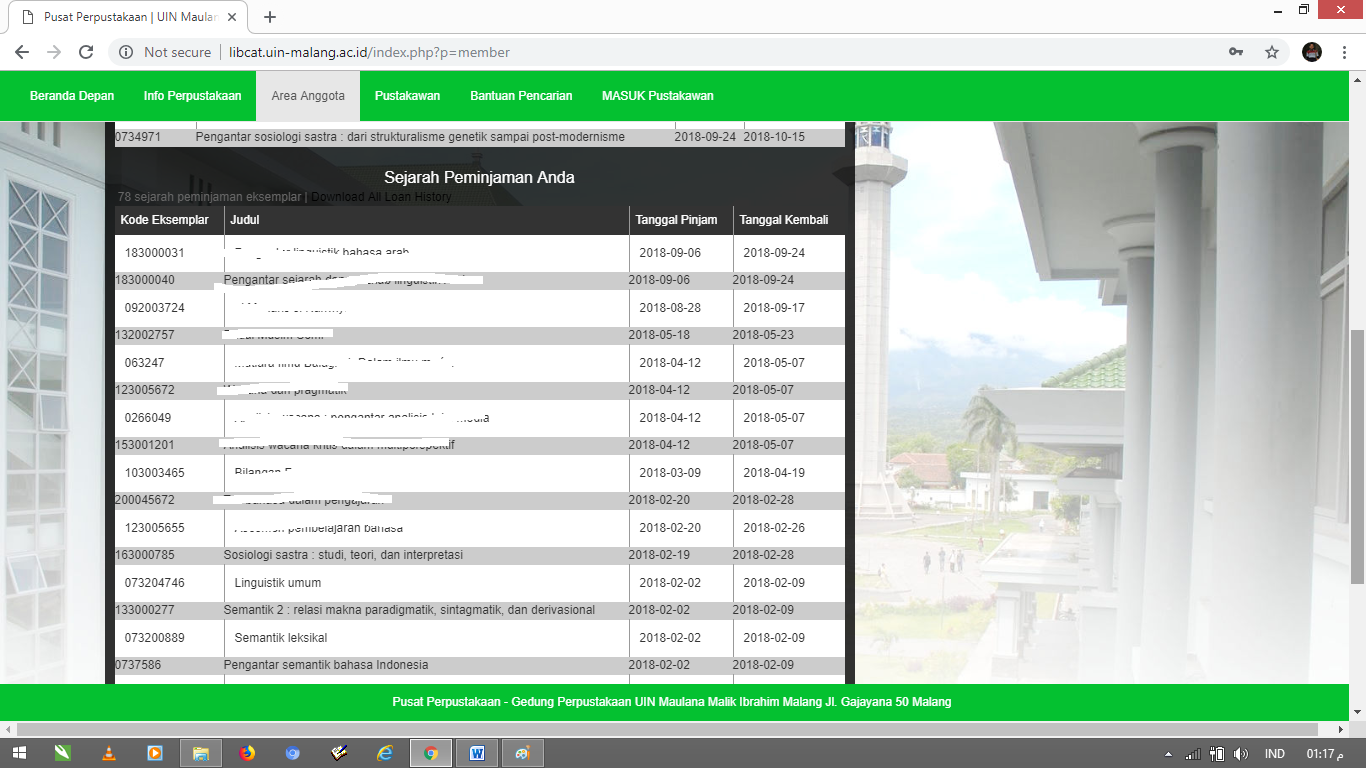 Banyak temen-temen kampus yang bertanya kepada saya, bagaimana cara ngecek denda peminjaman perpustakaan? Gimana ngecek data peminjaman buku di perpustakaan? semoga kali ini tulisan saya bisa membantu temen-temen sekalian yang memiliki pertanyaan yang sama seperti diatas. Saya akan berbagi bagaimana cara mengecek data peminjaman buku di perpustakaan UIN Malang.