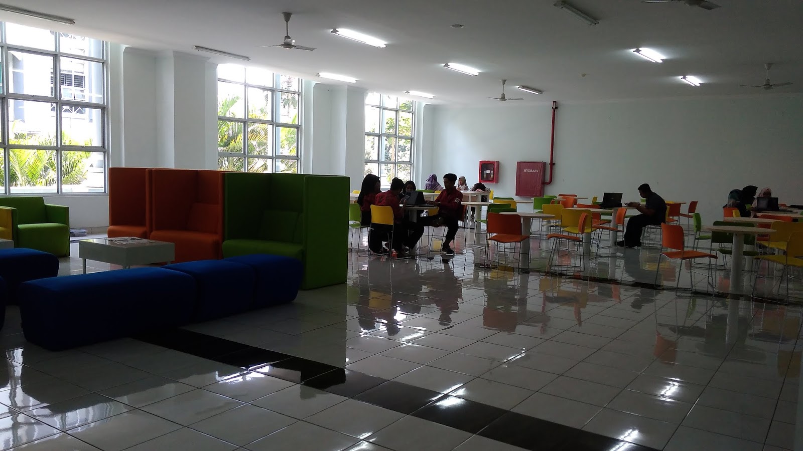 Ruangan ini terletak di Lantai 1 perpustakaan, ketika teman-teman masuk ke perpustakaan maka teman-teman pun dapat melihat banyaknya meja warna warni di ruangan tersebut. Nah tempat ini pun sangat cocok menjadi tempat berdiskusi ditambah lagi dengan terjangkaunya area Wifi. Jangan lupa untuk selalu menjaga kerapian meja dan kursi ya teman-teman.