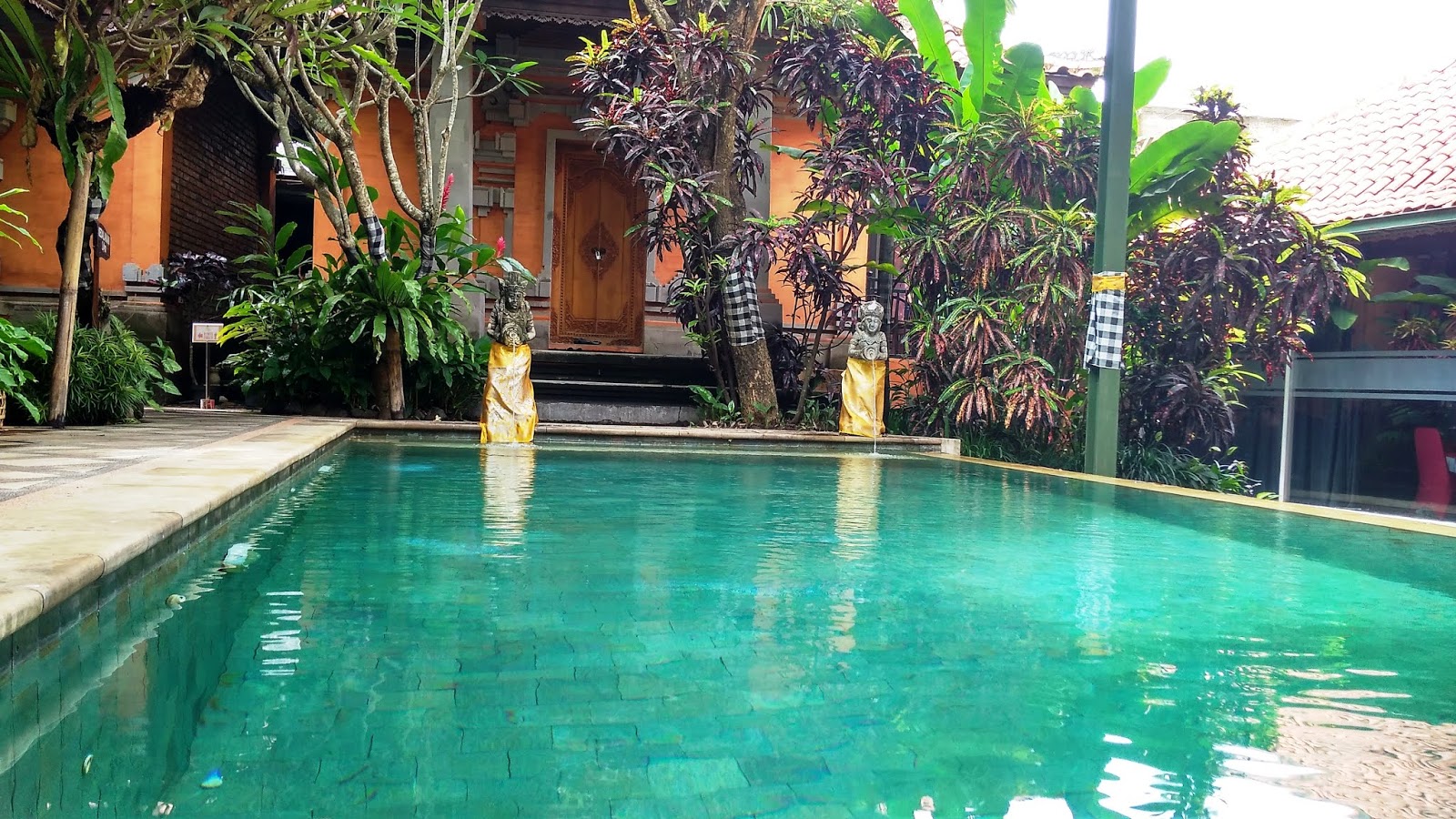 Selangkah demi selangkah menuruni anak buah tangga aroma-aroma khas Bali pun tidak asing lagi dalam penciuman kita. Terpajang rapi di dinding beberapa lukisan yang khas dengan motif Bali. Hotel bintang tiga ini memang menekankan nuansa Bali dalam setiap sudut ruangan hotel. Saya pun mencari tau harga masuk ke kolam renang ini, alhasil ternyata kita cukup membayar Rp.50.000,- per-orang untuk bisa berenang di Kolam hotel Ubud ini dan membayar Rp.35.000,- untuk yang reguler. Dengan membayar uang sejumlah tersebut kita akan di fasilitasi Handuk dan teh hangat. Namun untuk kelas reguler kita hanya bisa berenang saja tanpa mendapatkan fasilitas yang ada. Memasuki ke area kolam renang pun juga kita akan melihat kolam renang dengan nuansa Bali. Banyak tanaman-tanaman kamboja dan relief-relief khas Bali yang akan menambah keindahan Kolam Renang tersebut.