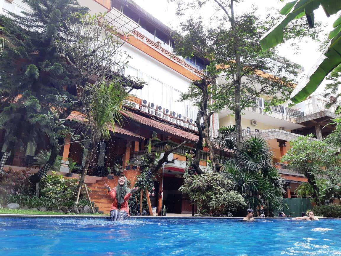 Byuuurr,,, akhirnya kita pun berenang di kolam, kolam renang untuk anak-anak itu berukuran sekitar 500 cm hingga 1 M, sedangkan untuk orang dewasa sekitar 1,5 M hingga 2 M. Terdapat empat patung yang terdapat disekitar kolam renang yang memancurkan air dari sisi patung tersebut. Disebalah kolam renang juga terdapat aliran sungai yang cukup deras. Keasikan bermain air sampai tak sadar kita telah menghabiskan 2 jam untuk berenang. Akhirnya kami pun memutuskan untuk selesai. Kolam renang ini menyediakan kamar mandi untuk ganti baju dan juga musholla. Jadi temen-temen tinggal menikmati fasilitas yang telah disediakan di hotel tersebut.