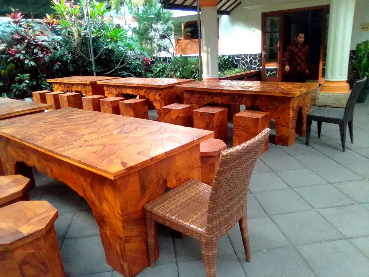Jika teman-teman memilih meja dengan kursi juga tersedia di ruangan Outdoor. Meja kursi didesain dan dibuat dari kayu sehingga membuat nuansa restoran lebih alami. Namun kebanyakan meja dan kursinya beberbentuk persengi panjang yang dapat menampung maksimal 10 orang dalam satu meja.