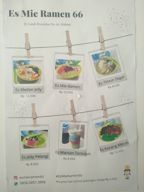 Beberapa waktu yang lalu saya sedang mengikuti acara seminar di daerah Blimbing, karena berangkat kesiangan seminar pun sudah mau selesai. Alhasil saya pun puter arah dan mengurungkan niat untuk pergi ke sana, dasar labil, wkwkwk. Siang itu benar-benar panas sekali, sehingga haus dahaga ini tak tertahankan lagi. Akhirnya saya pun mencari kedai es sekaligus mau ngadem sebentar. Ketika berada di jalan triwulan, ada satu kedai es yang benar-benar bikin saya tertarik. Iya, Es Mie Ramen 66 sangat membuatku penasaran akan seperti apa bentuk dan rasanya ya. Apakah es dengan santan mie ramen, atau es yang diberi mie, atau mungkin es ala-ala jepang? Daripada bingung nebak-nebak sendiri, nggak jelas, saya pun langsung menghampiri kedai es tersebut.